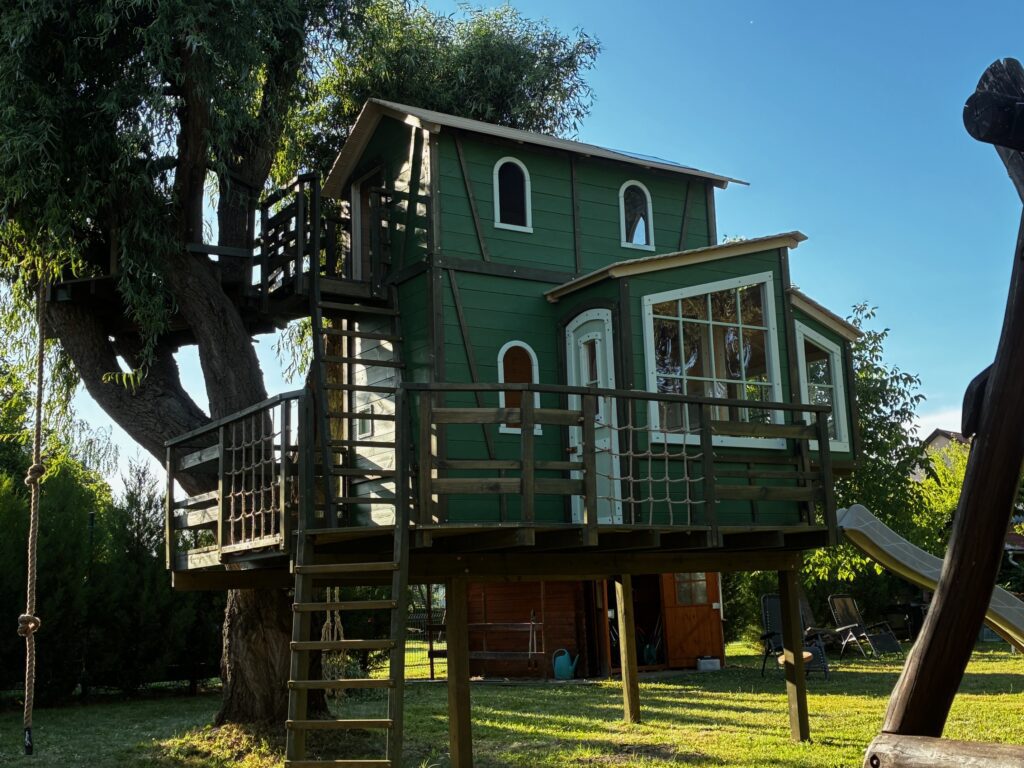 A 150 centiméteres platformon elhelyezkedő, több szintes faház három gyerek számára készült és minden porcikájában a játék, felfedezés és elbújás örömét szolgálja.