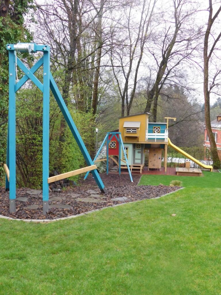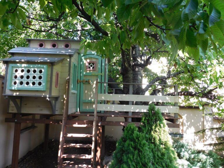 Az évekkel korábban Cseresznyés ház néven épült lombházam egy másik család kertjébe költözött. Némi javítgatást és festést követően újra szolgálatba állt. A ház lábai kaptak egy toldást, így most már 2 méter magas platformra került és az egyik oldalához egy jókora 2-üléses hinta lett csatlakoztatva.