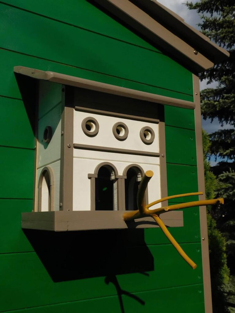 A lombházaim eldugottabb külső falaira kerülnek a madáretetők. Készítek egy kis reteszelővel nyitható ablakot, amin keresztül, bentről a házikóból szórhatnak magot az etetőbe a gyerekek. Az ablakocska közepén lévő ajtókukucskáló lencséin át egy fura, meseszerű perspektívában figyelhetik a madarakat.